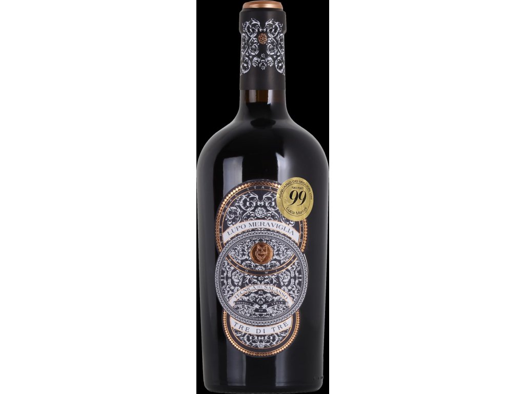 Lupo Meraviglia – Tre di Tre je mistrovské dílo z jižní Itálie, konkrétně z oblasti Apulie. Jeho název „Tři ze tří“ odkazuje na unikátní kupáž tří místních odrůd: Negroamaro, Primitivo a Malvasia Nera. Víno je vyráběno tradiční metodou Tecnica del Salasso, která koncentruje chuť i barvu, a zraje v dubových sudech, aby získalo jemné vanilkové a kořenité tóny.
